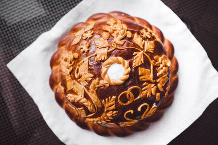 Wedding bread on oven tray. Baked product with decoration. Traditions of homeland. Invite guests for the holiday.