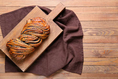 Board with tasty poppy seeds bun on wooden background