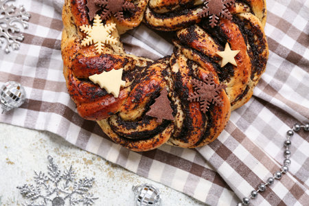Tasty Christmas pastry wreath, decorations and napkin on light table, closeup