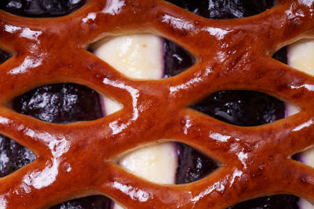 Fragment of a pie with fruit filling. Close-up of a pie with fruit filling. Homemade baking