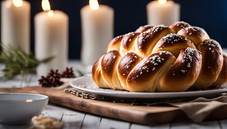 A freshly baked challah bread, still warm and golden, on a wooden table with candles in the background.