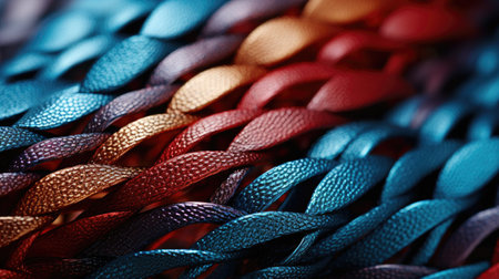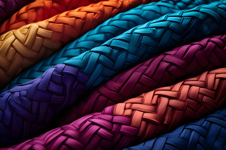 Prepare to be mesmerized by this close-up shot showcasing an incredible display of intricate textiles. The vibrant and realistic art style highlights the delicate nature and impressive craftsmanship of the weavings. The composition features an array of contrasting colors, diverse patterns, and exquisite textures, captivating the viewer's attention and inspiring an appreciation for the beauty found in everyday objects. This visually stunning image is destined to be a popular choice on microstock sites, attracting a wide range of users looking for eye-catching visuals to enhance their creative projects.