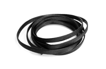 Black Cable with snake skin. Black braided wires in bundle on black background. Braided Sleeving. Data line protection. Wire Flame-retardant nylon tube