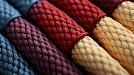 An intricate close-up of vibrant, natural fiber ropes showcasing a mix of colors and textures, perfect for craft or design projects.