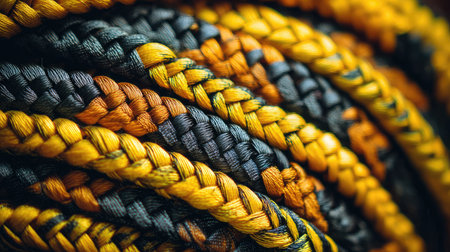 Close-up of interwoven blue and yellow ropes, abstract background with textured pattern.