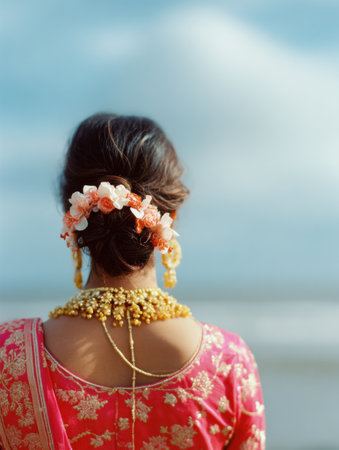 Bridal hair styled elegantly with sindoor seen from behind, framed by a gentle sky, evoking the spirit of celebration and cultural beauty.