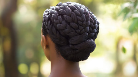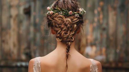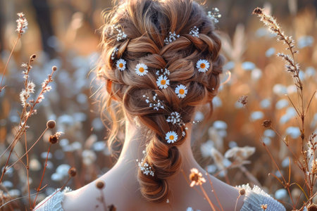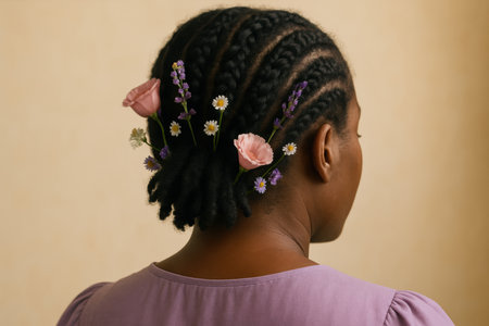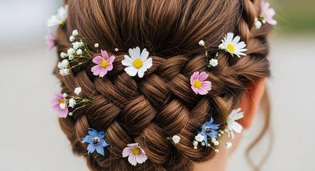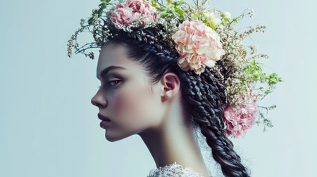 A creative shot of a woman with an intricate braided hairstyle, adorned with flowers, showcasing the elegance and artistry of contemporary hair fashion.