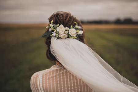 wreath with flowers Rear view blonde bride with a chick coiffure
