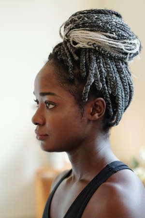 Head of pensive young Black woman with braided hair in bun looking in front of her