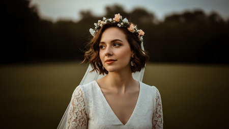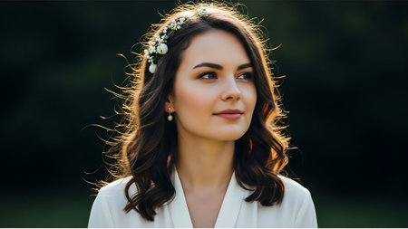portrait of beautiful young woman in white dress with flowers in hair