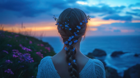 A young woman stands on a cliff, her braided hair adorned with blue flowers, gazing at the vibrant sunset over the ocean, surrounded by wildflowers.