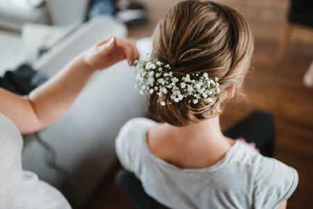 photo of flowers in a brides hair getting ready