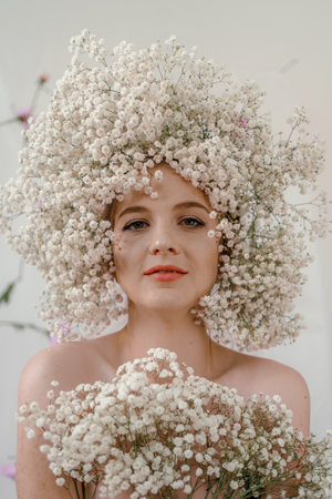 Portrait of sensual blond woman with flowers. Beautiful girl with flowers in her hair. Summer Beauty. Art in a contemporary style. A gypsophila wreath on a white background.