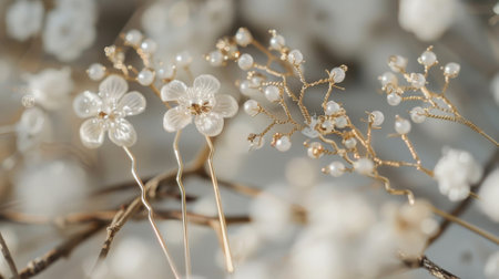 These hairpins feature delicate gold branches and tiny white flowers perfect for adding a romantic touch to a summer garden wedding hairstyle
