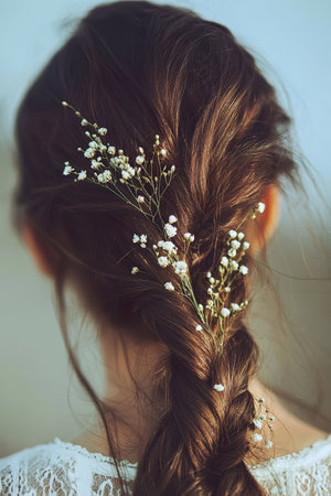fishtail braid decorated with babys breath flowers.