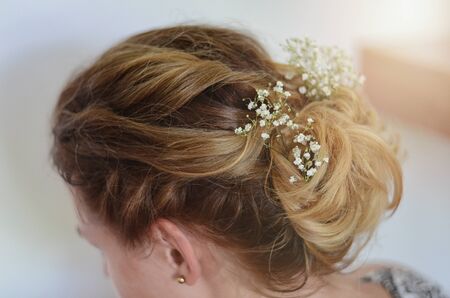 Wedding hairstyle with flowers in the hands of the bride