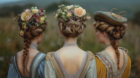 Three French women in 18th century costume with hat decorated with flower standing and looking at field.
