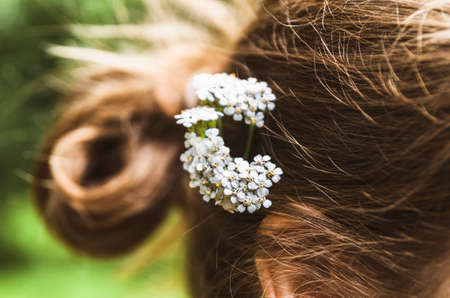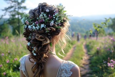 Back view of woman with floral hairpiece in hair, natural outdoor shot. Romantic and nature concept for design and print.