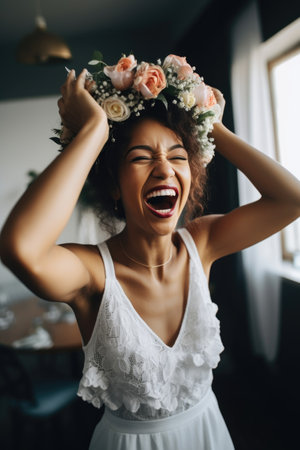 A woman wearing a flower crown on her head is smiling in a field of grass, showcasing a happy and fun headpiece at an event. The flower is a fashion accessory that adds to her joyful expression AIG50