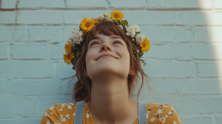 young woman with a wreath of flowers, looking at the sky generative ai