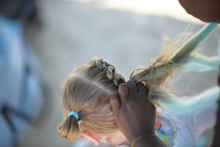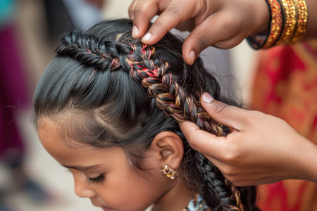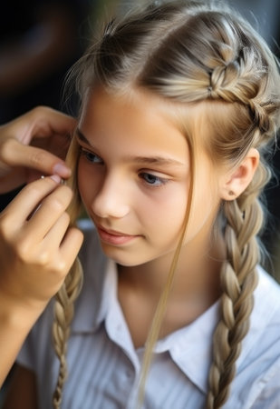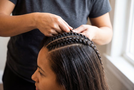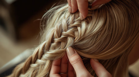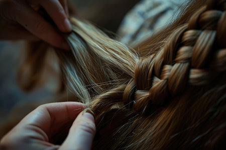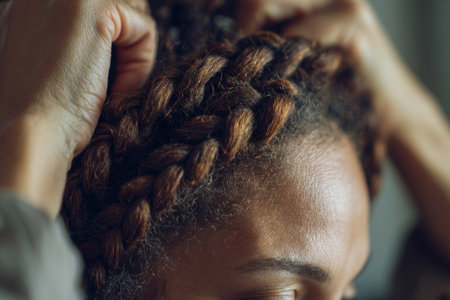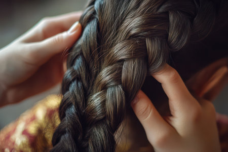 Close-up of hands braiding a girl hair, showcasing intricate styling, tradition, beauty care, and elegant hair artistry.