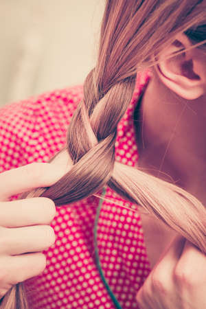 Fancy trendy blond hairstyle at home concept. Closeup of woman doing braid on blonde hair