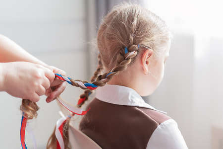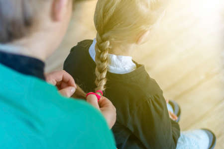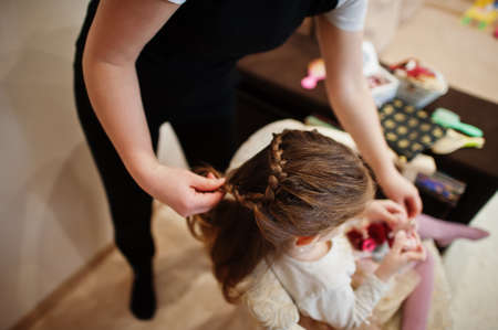 Mom braids her daughters pigtails. High quality photo