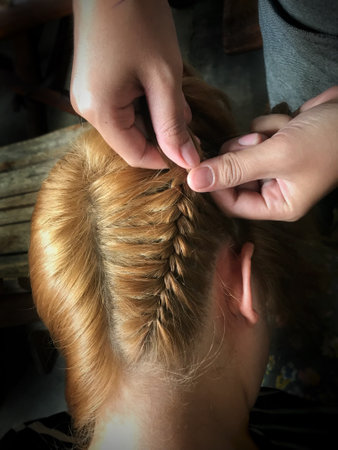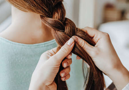 View of female hands weaving a braid from long female hair.