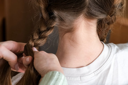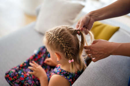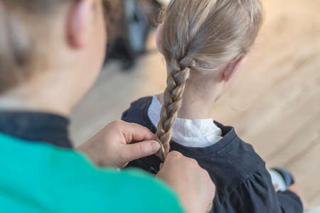 Mother braiding her daughter hair at home in the morning. Making braid on child girl head. Close up