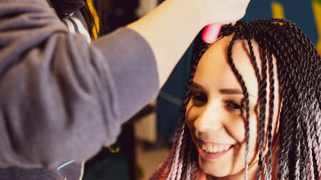 A female stylist attaches Senegalese braids to a woman in a beauty salon. Portrait of a beautiful lady with Senegalese pigtails in casual clothes. A hipster girl gets her hair done