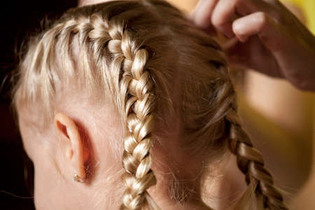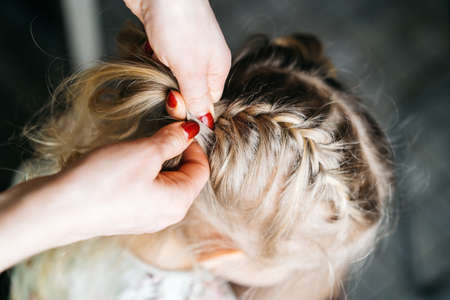 Female hands do a play. Mother braids a braid to the daughter. Concept care of the child's hair.