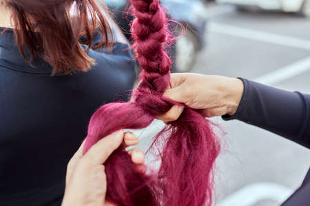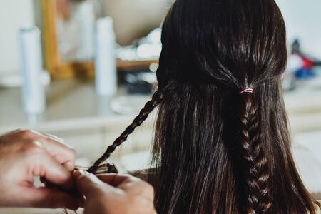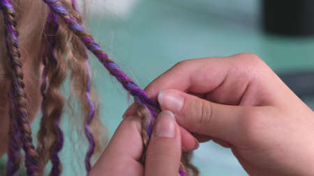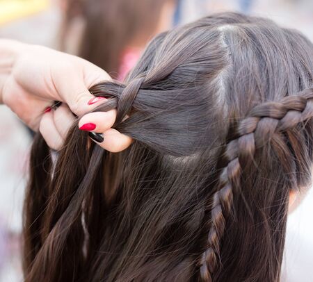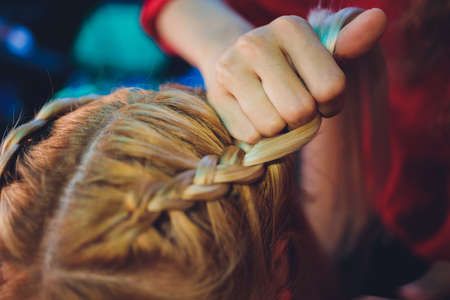 female hands with weave a braid out of hair at the hairdresser closeup