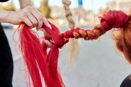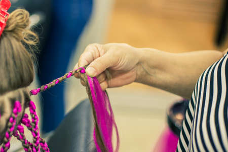 The process of braiding fashionable braids from bright pink and blue kanekalon for a girl. back to school. Braid studio. high quality photo
