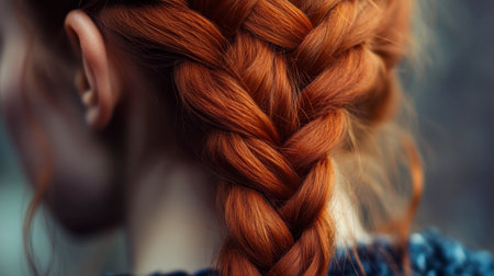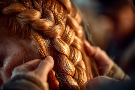 A close-up view of a beautifully intricate braided hairstyle featuring rich red hair. hands delicately work on the braid, showcasing the craftsmanship and detail involved in creating this elegant look, ideal for showcasing hair styling skills. Generative AI