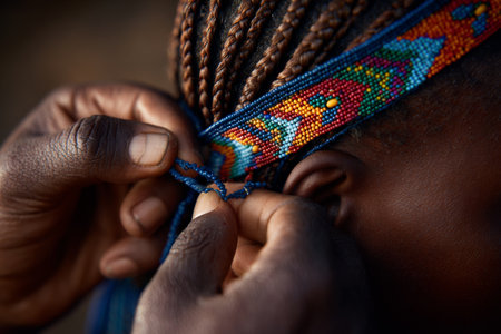 Hands attach carefully a handmade beaded accessory to a braided hairstyle, showing intricate patterns and bright colors. This moment captures cultural artistry and tradition.