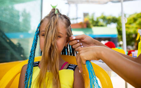A little waiting tanned girl in a bright yellow summer suit, weaves colored pink-blue African braids in her dark wet thick hair on a hot sunny sea day