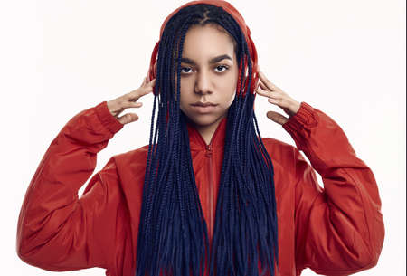 Portrait of beautiful african brunette teenage girl with dreadlocks wearing a red windbreaker listening music via wireless headphones isolated on studio background