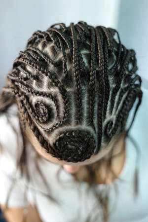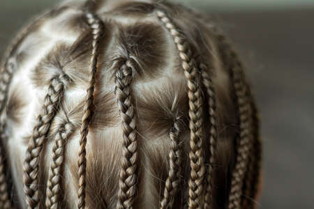 Festive, modern hairstyle with many small plaited braids. Texture of plates. Close up, selective focus
