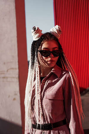 A closeup portrait of a stylish hipster woman with fancy pink sunglasses and micro braids hairstyle posing outdoors