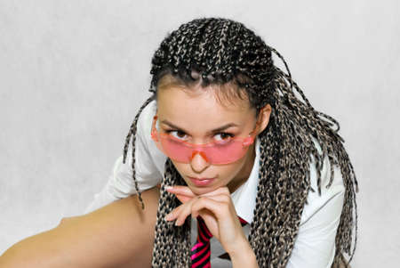beauty girl in shirt with striped tie and in pink sunglasses on a white background