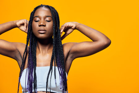 Young Black woman with braids relaxing against a vibrant yellow background, expressing tranquility and confidence through her body language and joyful demeanor