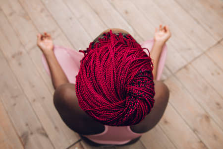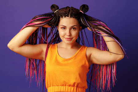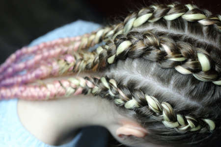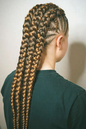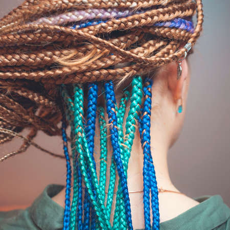 fashionable youth hairdo, colored hair, the result of the work of the master in the beauty salon, many small braids, interwoven through a pigtail crochet, an African style on European hair