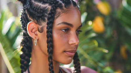 A detailed close-up portrait of a young woman with braided hair and thoughtful eyes, exuding a sense of calm introspection.
