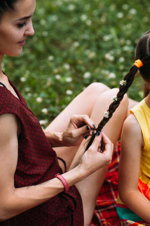 Little girl mother hairstyle picnic relax concept. Family values. Rest on the nature. Flowers in her hair.