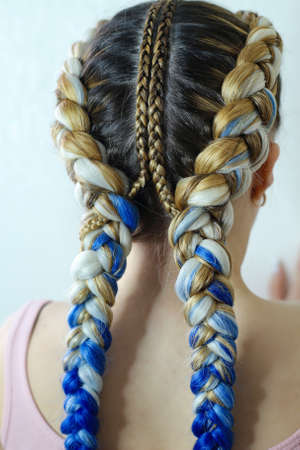 creative hairstyle of two braids with vpoyeniem blue kanekalona,
