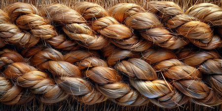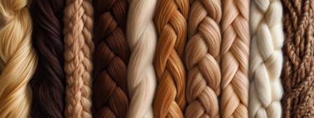 Collection of braided hair strands in various shades of blonde, brown, and black. Close-up texture background. Design for beauty, fashion, hair care, print, banner.