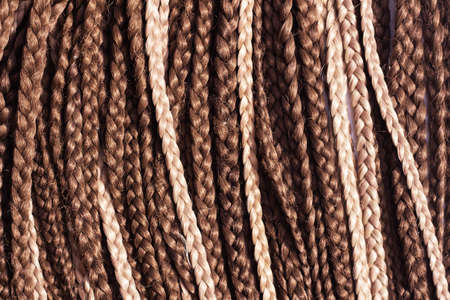 Texture of thin brown African braids, hair close-up braided in pigtails dreadlocks, Afro style