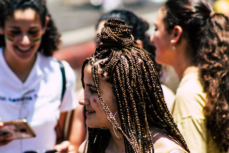 Tel Aviv Israel June 14, 2019 Portrait of unknown Israeli people participating to the gay pride parade in the streets of Tel Aviv in the afternoon