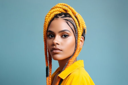 Pretty young afro-american woman with braids on the light blue studio background, Generative AI