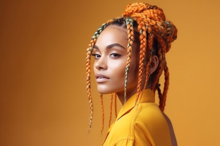 Pretty young afro-american woman with braids on the bright studio background, Generative AI